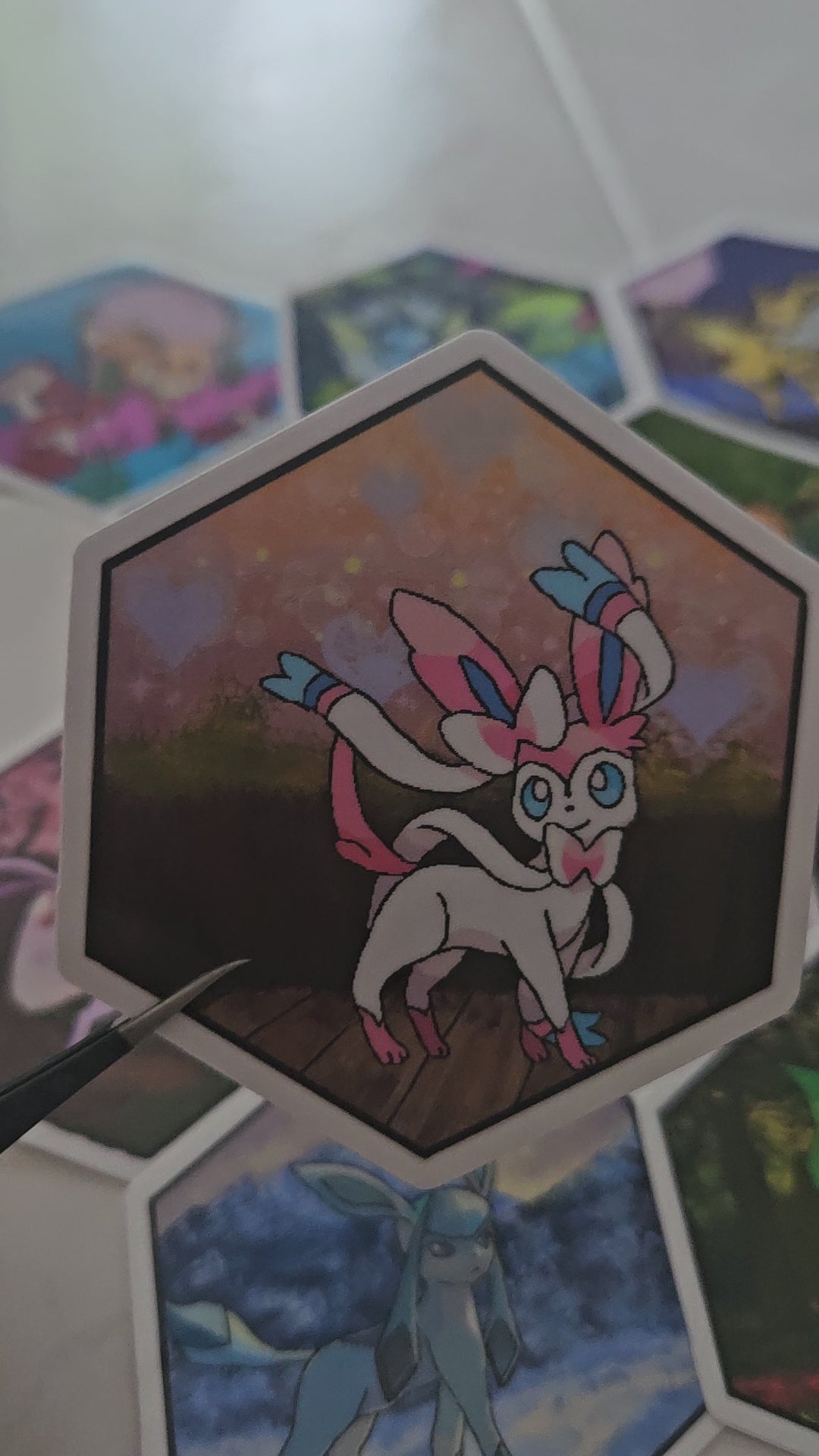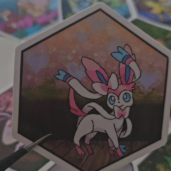 This 2 inch sticker is an original drawing of Sylveon with hearts and sparkles. This is a polyhedron shaped, die cut, glossy sticker that's perfect for any Pokemon fan! This sticker was printed with eco-solvent ink on glossy, high quality vinyl, and laminated with an additional protective film which makes it have a 3-5 year indoor/outdoor durability. You can stick this on your water bottle, thermos, laptop, car, sticker book, or anywhere else and expect it to stay just as cute as the day you got it for years to come!