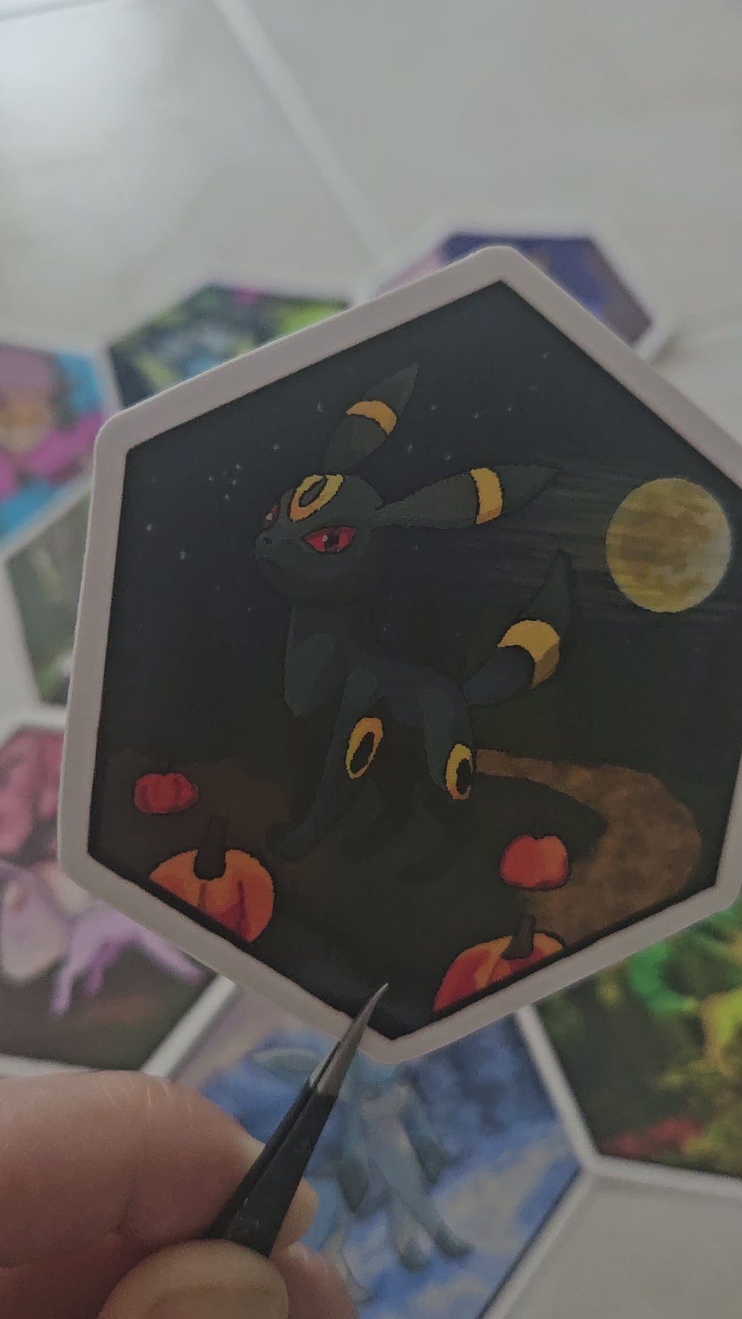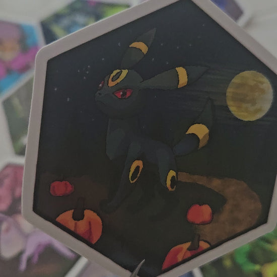 This 2 inch sticker is an original drawing of Umbreon in a pumpkin field with a full moon. This is a polyhedron shaped, die cut, glossy sticker that's perfect for any Pokemon or Halloween fan! This sticker was printed with eco-solvent ink on glossy, high quality vinyl, and laminated with an additional protective film which makes it have a 3-5 year indoor/outdoor durability. You can stick this on your water bottle, thermos, laptop, car, sticker book, or anywhere else and expect it to stay just as cute as the day you got it for years to come!